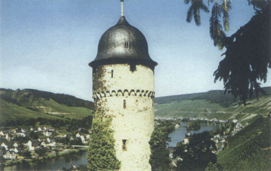 Hoch über den Weinbergen von Zell (Mosel) auf einer Anhöhe, sieht man den 1906 aus rotem Backstein gemauerten Collisturm.